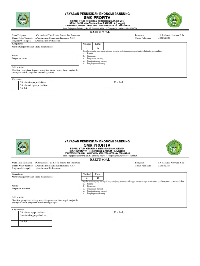 Program kerja kepala sekolah excel kepala sekolah sekolah kartu perpustakaan from id.pinterest.com. Contoh soal sarana dan prasarana kelas 11 beserta jawabannya. Menurut nawawi 199363 mengatakan bahwa usaha pengadaan sarana prasarana yang dibutuhkan sehingga dapat digunakan secara tepat memerlukan dan mengembangkan sejumlah dana komunikasi yang cepat dan tepat dalan kebutuhan peralatan dapat memungkinkan disusunnya perencanaan yang lengkap. Promes otomatisasi tata kelola sarana dan prasarana jam pelajaran 420 jp @ 45 menit no kompetensi dasar jp 3.1 memahami ruang lingkup administrasi 1 6 sarana prasarana kantor 4.1 melakukan pengelompokkan ruang lingkup 2 6 administrasi sarana dan prasarana distribusi jam pelajaran otomatisasi tata kelola sarana dan prasarana no kompetensi jp juli agustus september oktober november desember. Untuk smk nama dan mak kelas kelas xii no absen semester pdf. Contoh soal kepegawaian kelas 11 pilihan ganda guru ilmu sosial. Contoh soal dan jawaban sarana dan prasarana ilmusosial id. Kelas xi sarana dan prasarana 1 soal soal evaluasi pdf is the indonesian regulation of standard level of. Soal dan jawaban sarana dan prasarana kelas 12 guru galeri. Akuntansi keuangan kelas 11 guru ilmu sosial. About press copyright contact us creators advertise developers terms privacy policy & safety how youtube works test new features press copyright contact us creators. Soal otks otomatisasi tata kelola sarana dan prasana kelas xi.mp jumat, 06 september 2019. Latihan soal otk sarana dan prasarana latihan i.